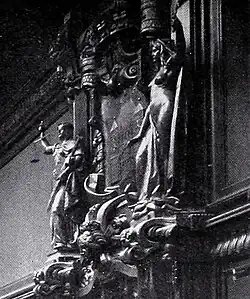 - Gerechtigkeit, Allegorie, Göttin der Gerechtigkeit, Statue an Eingangsportal, Rathaus Elberfeld, installiert 1901, ca. 270 cm hoch, getriebenes Kupfer (bei G. Knodt, Bockenheim), im Juni 1943 irreparabel beschädigt oder unbeschädigt eingeschmolzen, 2010 ersetzt durch restaurierte Gerechtigkeit in der Ausführung ursprünglich für das Charlottenburger Rathaus, Arbeit von Schwan Kamal[56][57][30]