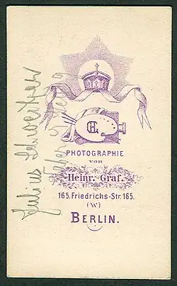 - ↑ Greven Archiv Digital, Fotografenwiki, „Heinrich Graf“, https://fotografenwiki.greven-archiv-digital.de/index.php?title=Heinrich_Graf . Etwas abweichend die Angaben in der Datenbank „Berliner Fotografenateliers des 19. Jahrhunderts“, https://www.berliner-fotografenateliers.de/index2.html : Friedrichstraße 165 im Jahr 1865 und in den Jahren von 1870 bis 1884, Wilhelmstraße 57/58 von 1885 bis 1890 und 1893 bis 1896, Leipziger Straße 8 von 1890 bis 1891