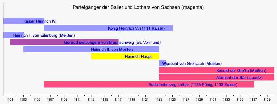- ↑ Klaus Naß (Hrsg.): Scriptores (in Folio) 37: Die Reichschronik des Annalista Saxo. Hannover 2006 (Monumenta Germaniae Historica, Digitalisat), ISBN 3-7752-5537-0, S. 557: Heinricus cum Capite de Misna a filiis comitum Lodouuici et Uuicberti, qui capti ab inperatore detinebantur, capitur. […] Anm. 20: Heinrich Haupt. Burggraf von Meißen 1113–1116.