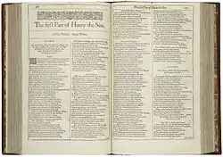 - ↑ So gehen etwa die Herausgeber des New Oxford Shakespeare davon aus, dass der erste Teil von Henry VI wahrscheinlich als nachträgliches Prequel zu den vorangegangenen publikumswirksamen Aufführungen der letzten beiden Teile entstanden ist. Dafür spricht aus ihrer Sicht unter anderem auch, dass das Stück in den frühen Aufführungen zunächst unter dem belegten Titel Harry the Sixth auf die Bühne gebracht worden war und erst in der Druckfassung der First Folio von 1623 als The first Part of Henry the Sixt betitelt wurde. Vgl. Gary Taylor, John Jowett, Terri Bourus und Gabriel Egan (Hrsg.): William Shakespeare: The Complete Works. Modern Critical Edition. The New Oxford Shakespeare, Oxford University Press 2016, ISBN 978-0-19-959115-2, S. 926. Laut Hans-Dieter Gelfert können ebenso die Titelangaben für den Teil 2 in der Quarto-Ausgabe von 1594 (The First Part of the Contention of the Two Famous Houses of York and Lancaster) und den Teil 3 in dem Quarto-Druck von 1594 (The True Tragedy of Richard Duke of York and the Good King Henry the Sixth) als Indiz dafür gesehen werden, dass zunächst diese beiden Teile als Doppeldrama entstanden sind und Teil 1 nachträglich zum historisch besseren Verständnis der beiden übrigen Teile hinzugefügt wurde. Vgl. Hans-Dieter Gelfert: William Shakespeare in seiner Zeit. Beck, München 2014, S. 235. Siehe außerdem Günter Jürgensmeier (Hrsg.): Shakespeare und seine Welt. Galiani, Berlin 2016, ISBN 978-3-86971-118-8, S. 65, Ulrich Suerbaum: Der Shakespeare-Führer. 3. durchgesehene und ergänzte Auflage, Reclam, Ditzingen 2015, ISBN 978-3-15-020395-8, S. 240, sowie Ina Schabert (Hrsg.): Shakespeare-Handbuch. Die Zeit, der Mensch, das Werk, die Nachwelt. 5., durchgesehene und ergänzte Auflage. Kröner, Stuttgart 2009, ISBN 978-3-520-38605-2, S. 332. Vgl. ebenso Michael Dobson und Stanley Wells (Hrsg.): The Oxford Companion to Shakespeare. Oxford University Press, Second Edition 2015, ISBN 978-0-19-870873-5, S. 267.