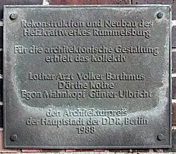 Zwischen 1974 und 1987 wurde das ehemalige Großkraftwerk zu einem Heizkraftwerk umgebaut.[7] Die thermische Leistung der Kraft-Wärme-Kopplung betrug 590 MW, die elektrische Leistung 188 MW. Die 1965 und 1974 vorgenommenen Ergänzungsbauten und Umbauarbeiten führten zum einen zur Modernisierung der technischen Ausstattung mit Ersatz der alten Schornsteine durch zwei neue aus Stahlbeton. Diese haben nun eine Höhe von 146 und 169 Metern (2016: ca. 144 m und ca. 146 m) und sind mit Elektrofiltern ausgestattet. Zum anderen kamen als Neubauten eine Betriebspoliklinik und eine Berufsschule hinzu. Wie das nebenstehende Foto ausweist, erhielt das Kollektiv der Architekten 1988 für die hier errichteten oder rekonstruierten Gebäude den Architekturpreis der Hauptstadt der DDR. Im Jahr 1987 wurde das Heizkraftwerk auf Braunkohlebetrieb umgerüstet. Dabei musste die Lager- und Transport-Logistik umgestellt werden, da die vorhandenen Lagerkapazitäten am Kraftwerk nicht für Braunkohle mit dem geringeren spezifischen Energiegehalt bemessen waren.