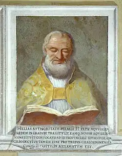 Nach dem Chronicon Altinate war Helias „nacione Graecorum“. Er war, wie Ernst Stein nachweisen konnte,[1] ab 571 Patriarch, nicht wie Bice Stoppato annahm,[2] ab 573. Aquileias Selbsterhebung zum Patriarchat war erst 557 durch Helias’ Vorgänger Paulus erfolgt (belegt zuerst 559), den sein Gegenspieler Papst Pelagius I. herablassend als „Paulinus“, also in der Verkleinerungsform, bezeichnet hat. Erst auf der Synode von Grado lässt sich belegen, dass der Patriarchentitel auch offiziell beansprucht wurde, also zur Zeit des Helias. Papst Pelagius konnte die oströmische Herrschaft nicht dazu bewegen, dem „Aufstand“ ein Ende zu setzen,[3] der 557 begonnen hatte, und der sich bis zum Ende des 7. Jahrhunderts hinziehen sollte. Als die Langobarden 568 den Nordosten Italiens eroberten, leitete Paulus den Umzug ins sicherere Grado, doch starb er bereits im nächsten Jahr. Aquileia war zu dieser Zeit der einzige noch verbliebene schismatische Metropolitensitz.