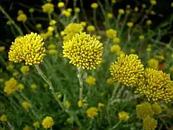 Der dichte, stark verzweigte, zymöse Gesamtblütenstand besteht aus nur schwach dünn gestielten körbchenförmigen Teilblütenständen. Das Blütenkörbchen ist zylindrisch, unbehaart und glänzend, die Schuppen überlappen sich dachziegelartig. Die Blütenkörbchen enthalten zehn bis zwölf Einzelblüten. Die Blüten sind gold-gelb, stumpfspitzig, die äußeren sind etwas kürzer.