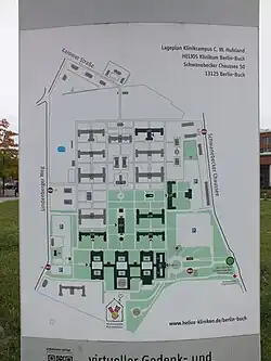 IV: gelegen in Alt-Buch, zuvor als Städtisches Krankenhaus für Orthopädie und Rehabilitation eröffnet und betrieben. Das war hervorgegangen aus einer 1903 als Heimstätte für Lungenkranke im Schlosspark Buch 1901–1903 errichteten Anlage. Der Eingang liegt an der Straße nach Zehdenick und ist an einem erhaltenen Pförtnerhäuschen erkennbar.[4]