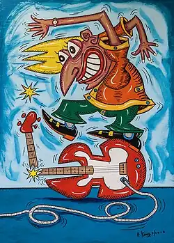 Helmut King hat Schlüsselszenen der Rocking Sixties und Seventies in einem umfangreichen Werkzyklus festgehalten. Grell, bunt, schrill, kantig. Jedes Bild enthält comicartig eine Unmenge von Details. Er erzählt mit seinen Gemälden und Zeichnungen richtige Stories.