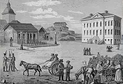 Die Hauptstadt des neugegründeten Großfürstentums Finnland war anfangs Turku, die bis dahin größte und bedeutendste Stadt des Landes. Aus Sicht von Zar Alexander I. war Turku aber zu weit von Sankt Petersburg entfernt, weshalb er am 8. April 1812 per Dekret Helsinki zur neuen Hauptstadt bestimmte.[24] Die Stadt war zu diesem Zeitpunkt mit rund 4000 Einwohnern eher unbedeutend. Der deutsche Architekt Carl Ludwig Engel wurde damit beauftragt, das durch den Stadtbrand zerstörte Helsinki als repräsentative Hauptstadt neu aufzubauen. So entstand das klassizistische Zentrum rund um den Senatsplatz. Die umliegenden Stadtviertel bestanden aus meist einstöckigen Holzhäusern, von denen heute nur noch einige vereinzelte erhalten sind. Seit 1819 war Helsinki Sitz des finnischen Senats und damit endgültig Hauptstadt des Großfürstentums.