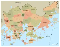 Zu Beginn des 20. Jahrhunderts beschränkte sich das Stadtgebiet Helsinkis noch auf die Halbinsel Helsinginniemi. Dieses Gebiet wird heute als Kernstadt (kantakaupunki) bezeichnet. Die Stadt war umgeben vom Gebiet der Landgemeinde Helsinki (Helsingin maalaiskunta), deren Reste das heutige Vantaa bilden.
