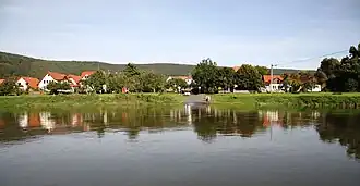 Rollfähre zwischen Veckerhagen und Hemeln, im Hintergrund Hemeln und der Bramwald