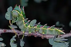 Ausgewachsene Raupen haben eine grasgrüne Grundfarbe und sind auf jedem Körpersegment mit rötlichen Tuberkeln versehen. Deutlich heben sich ein gelber Seitenstreifen sowie hellviolette Schrägstriche ab. Über den Bauchbeinen befinden sich viele kleine gelbe Punkte.
