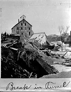 Am 5. Oktober 1869 brach der Fluss durch die dünne Kalksteinschicht.[6] Der rauschende Strom durchspülte den Tunnel, brachte Teile von Hennepin Island zum Nachgeben und verursachte den Einbruch des Erdreiches, das die Saint-Anthony-Fälle einbettete.[5][6] Es gab unmittelbar Befürchtungen, dass das Flussbett zerbröckeln könnte und dadurch die Wasserfälle in eine lange Reihe von Stromschnellen verwandelt würden. Ein Zeitzeuge erinnert sich,
