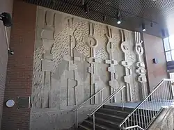 In der Eingangshalle auf der Nordseite des Boulevard Henri-Bourassa ist ein 5,2 m hohes und 7,3 m breites Wandbild aus Gussbeton angebracht. Das Werk Réveil de la conscience par la solitude („Erwachen des Bewusstseins durch die Einsamkeit“) von Jacques Huet stellt die Entwicklung zweier Figuren vom Negativen zum Positiven dar. Es dient gleichzeitig als Brandmauer zwischen der Eingangshalle und dem benachbarten Verwaltungsgebäude der Regierung.[4]