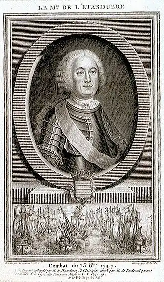 Als der Marineminister erfuhr, dass es in den Kolonien an Nahrungsmitteln mangelte, ließ er 1747 252 Schiffe mit allen notwendigen Vorräten beladen. Da man jedoch befürchtete, dass diese Flotte gekapert werden könnte, beschloss der Hof, eine Gruppe von Begleitschiffen für den Schutz abzustellen. Für die Führung dieses Konvois wurde Estenduère abgestellt, der als Eskorte acht Linienschiffe und eine Fregatte zur Verfügung hatte.