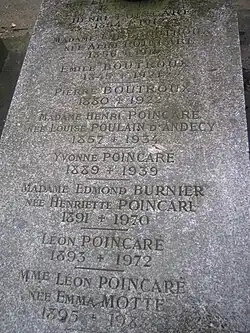 Poincaré starb eine Woche nach einer Prostataoperation, die zunächst erfolgreich erschien, an einer Embolie. Sein Familiengrab ist im Cimetière Montparnasse in der Sektion 16 gleich neben dem Tor Rue Émile-Richard zu finden.