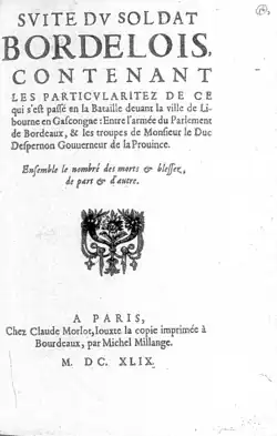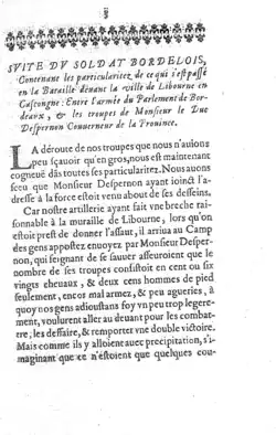8. Recherches internationales sur les mazarinades (RIM): SVITE DV SOLDAT BORDELOIS (Mazarinade zur Schlacht bei Libourne 26. Mai 1649), vgl. Online. Abgerufen am 2. Februar 2021