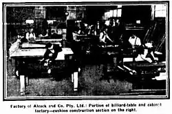 - ↑ a b c d e f g Billiard Table Making Bericht über Alcock’s & Co. im The Argus Melbourne vom 9. September 1926. Abgerufen am 13. Juli 2013.