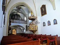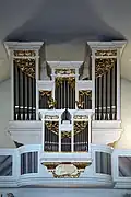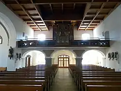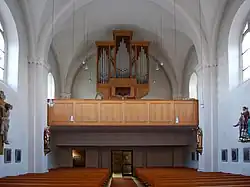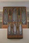 II/P | 29 | Die ursprüngliche, 1930 bei Josef Panhuber in Auftrag gegebene und 1933 fertiggestellte Orgel war mit pneumatischer Traktur ausgestattet, wurde aber 1962 von Philipp Eppel auf ein elektropneumatisches System umgebaut. Als Herbert Gollini 1980/81 eine neue Orgel errichtete, konnten 19 Register der Panhuber-Orgel wiederverwendet werden, 10 Register wurden neu angefertigt. Im Zuge der 2002 von Achim Reichmann durchgeführten Renovierung wurde die Trompete 8', deren Becher durch Gollini von Panhuber übernommen worden waren, gegen eine neue getauscht.[4] |