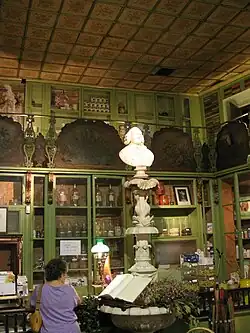 An der verzierten Kassettendecke befindet sich eine Lichtkuppel, die mit Glasmalerei versehen ist. Eine Galerie mit Ölgemälden ziert den Verkaufsraum, und die typischen zahlreichen Schubladen der Verkaufsregale wurden mit Miniatur-Landschaften in Aquarell versehen. In der Mitte der Halle befindet sich ein Marmor-Brunnen, der früher als Ort für die Haltung von medizinischen Blutegeln diente, sowie eine Büste von Carl von Linné, schwedischer Naturforscher und Schöpfer des derzeitigen Systems der Klassifizierung von Pflanzen. Die Steinmetzarbeiten stammen von den italienischen Brüdern Faust und Àngel Baratta i Rossi und wurden in Carrara-Marmor gemeißelt.