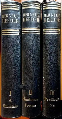 Herders Konversations-Lexikon fand seine Fortführung im Konversationslexikon Der Große Herder, das in der vierten Auflage ab 1931 und in der fünften Auflage ab 1952 erschien. 1925 erschien Der Kleine Herder in einem Band (zwei Halbbände), der neben Strichzeichnungen erstmals auch Autotypien im Text enthielt.[1] Zudem erschienen ab 1949 mehrere Auflagen der kompakteren Allgemeinenzyklopädie Der Neue Herder, die in ihrer ersten Auflage sogar teilweise in einem Telegrammstil verfasst war.