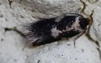 Die Falter zählen zu den Kleinschmetterlingen und erreichen eine Flügelspannweite von etwa 6 mm.[1] Ihre Vorderflügel sind überwiegend schwarz gefärbt und weisen an der Basis einen größeren weißen Bereich auf. Auf knapp halber Länge befindet sich am Flügelvorderrand ein weißer Fleck. Etwas weiter von der Flügelbasis entfernt befindet sich ein weiterer weißer Fleck am Flügelinnenrand. Die Hinterflügel sind hell-beige gefärbt. Die Schuppen am Vorderkopf sind orange-hellbraun gefärbt. Es gibt mehrere verwandte Arten, deren Falter ähnlich aussehen, insbesondere die Art Ectoedemia subbimaculella.[1]