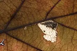 Die Art nutzt als Wirtspflanzen die Edelkastanie (Castanea sativa) sowie verschiedene Eichenarten, darunter die Portugiesische Eiche (Quercus faginea), Quercus ithaburensis subsp. macrolepis, die Traubeneiche (Quercus petraea), die Flaumeiche (Quercus pubescens) und die Stieleiche (Quercus robur).[4] Die Eier werden auf der Blattoberseite der Wirtspflanzen nahe einer Blattader abgelegt. Die Raupen minieren in der Zeit von Ende September bis November in den noch grünen Teilen der vergilbenden und teils schon auf den Boden gefallenen Blättern. Die Mine beginnt als schmaler Korridor entlang einer Blattader, gewöhnlich entlang der Mittelrippe oder einer Längsader, und verbreitert sich abrupt zu einer breitflächigen Mine.[4] Die Raupen verlassen schließlich die Blattmine und spinnen sich am Boden ein Kokon, in dem sie sich verpuppen.[4] Die Flugzeit der Falter dauert von Mai bis Juli.[3]