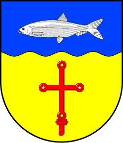 Blasonierung: „Von Blau und Gold im Wellenschnitt erhöht geteilt. Oben ein silberner Hering, unten ein abgebrochener roter Kreuzstab.“[4]