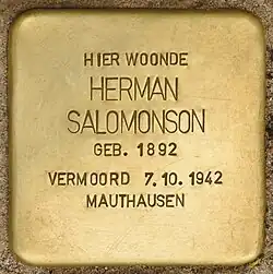 - ↑ Herman Salomonson (Amsterdam, 24 maart 1892 – Mauthausen, 7 oktober 1942). In: oorlogsbronnen.nl. Abgerufen am 7. Oktober 2022 (niederländisch).