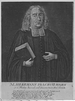 - ↑ Manzeln: Ausführliche, gegründete und accurate Nachricht von dem Leben und Tode Tit. Herrn M. Herrmann Joachim Hahns …, S. 22.