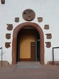 Eingang zur Abteikirche Neuburg, Heidelberg. Oben der als Spolie eingemauerte Wormser Wappenschlussstein des Erzbischofs