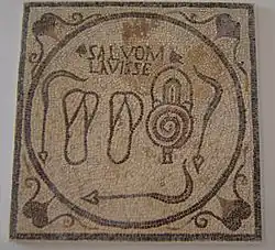 Bevor die Gäste kommen, geht es erst noch in die Thermen des Tigellinus.[17] Es ist die achte Stunde, also 14 Uhr nachmittags, die richtige Zeit für ein Bad. Der Protagonist weist seine Begleiter an, die Kleider zu bewachen (in den Thermen trieben Kleiderdiebe ihr Unwesen) und Salböl und Weihrauch der besten Qualität für ihn zu kaufen. Entkleidet und geölt, begibt er sich ins Schwitzbad (Sudatorium). Er lässt sich Seife reichen und lobt, dass das Wasser gut temperiert sei. Dann geht er zum Abkühlen nach draußen. Er erfrischt sich im Schwimmbecken.[18] Nun lässt er sich eine Strigilis und Handtücher reichen. Man bringt seine Schuhe und kleidet ihn an.[19] Die Badeszene im Colloquium Montepessulanum schließt, ähnlich wie in anderen Colloquia, mit Komplimenten, die man dem Badegast macht. Sprüche wie salvum lotum oder salvum lavisse, „wohl gebadet!“, sind auch von Bodenmosaiken antiker Badeanlagen bekannt (Foto).[20]
