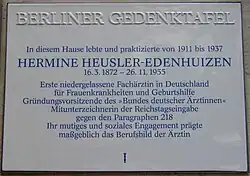 - ↑ Heyo Prahm (Hrsg.): Hermine Heusler-Edenhuizen. Die erste deutsche Frauenärztin. 3. Aufl. Budrich, Opladen 2011, ISBN 978-3-86649-494-7. S. 232. (Mit Foto des Grabes.)