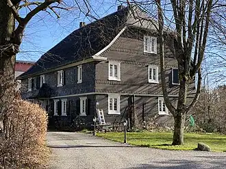 Der Hof gehörte bis zu Beginn des 19. Jahrhunderts zur Abtei Altenberg. Das jetzige Gebäude ist ein zweigeschossiger verschieferter Fachwerkbau aus der ersten Hälfte des 19. Jahrhunderts mit leicht vorkragendem Obergeschoß, umbiegendem Kranzgesims und Krüppelwalmdach. Auf dem Gelände des Gutshofs befindet sich die Grabkapelle der Familie Rost aus den 1945er Jahren, im Inneren eine Grabplatte mit Inschrift.