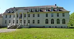 Die neunachsige Fassade der Parkseite wurde nach Osten um vier Achsen erweitert, von denen die im Untergeschoss durch Rundbogenfenster gebildet werden. Ein dreiachsiger Säulenportikus mit Dreiecksgiebel umgibt den Parkzugang. Davor befindet sich eine Terrasse mit Freitreppe.