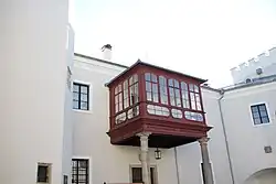 An der Südwand des Hofes befindet sich ein hölzerner verglaster Balkon über zwei dorischen Säulen aus Granit. Es diente als Vorbau für das im 19. Jahrhundert errichtete Treppenhaus. Unter dem Verandavorbau befindet sich das wappenbekrönte Portal zur Hauptstiege, das bis 1987 von je zwei kannelierten Stuckpilastern mit Kapitellen gerahmt war.[19]
