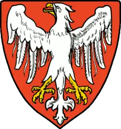 Aufgrund des Grafentitels derer von Lindow-Ruppin wurde die Herrschaft Ruppin seit dem Ende des 13. Jahrhunderts auch als Grafschaft Ruppin bezeichnet.[1] Trotzdem war Ruppin eine Herrschaft, keine Grafschaft. Das Wappen der Herrschaft Ruppin zeigte ähnlich dem der Grafen von Lindow-Ruppin in Rot einen silbernen Adler goldbewehrt.[2]