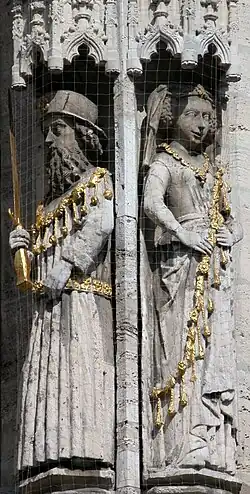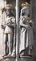 Otto III: (980–1002) starb unverheiratet. Die Identität der Frau an seiner Seite ist ungeklärt. Es wurde vermutet, dass es sich bei der Dargestellten entweder um seine Mutter Theophanu (s. o.) handeln könnte oder um seine Großmutter väterlicherseits Adelheid von Burgund (s. o.). Für Braunschweig wahrscheinlicher erscheint hingegen, dass die Statue Maria von Aragon darstellt, bei der es sich nach einer im Spätmittelalter in Braunschweig verbreiteten Legende, die als historische Wahrheit betrachtet wurde, um die Ehefrau Otto III. handeln solle.[33][34] (Historische) Belege für eine Ehe Otto III. existieren indes nicht. Johann Georg Leuckfeld hatte bereits in seinem 1714 erschienenen Werk Antiquitates Halberstadenses darauf hingewiesen, dass Otto III. nicht verheiratet gewesen war.[35] Auch Carl Schiller hatte 1852 nochmals darauf hingewiesen, dass es sich um angebliche Ehefrau Maria Sophie von Aragonien handeln könne, Otto III. aber unverheiratet war.[36] | |