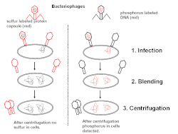 Hershey und Chase züchteten nun Phagen, die als T2-Phagen bezeichnet wurden, einmal unter Zugabe von radioaktiv markiertem Schwefel (35S) und in einer zweiten Petrischale unter Zugabe von radioaktiv markiertem Phosphor (32P). Der radioaktive markierte Schwefel wurde dabei in die Proteine eingebaut. Der radioaktiv markierte Phosphor in der anderen Petrischale wurde dagegen in die DNA der gezüchteten Phagen eingebaut.