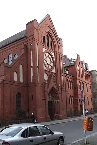 Es handelt sich um einen gegliederten Mauerwerksbau mit überwiegender Ziegelverblendung. In der dreiachsigen Straßenfassade springt das Mittelschiff leicht vor, ein Stufenportal bildet den Haupteingang. Ursprünglich krönte die Fassade ein Dachreiter, der nach den Zerstörungen des Zweiten Weltkriegs nicht wieder errichtet wurde. Seitlich sind gotische Strebepfeiler gemauert.