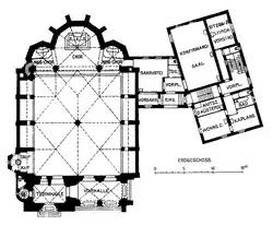 Der quadratische Grundriss des Schiffes der Saalkirche hat einen Mittelpfeiler, um den sich vier Teile eines Kreuzrippengewölbes gruppieren, wodurch sich sowohl in Längs- als auch in Querrichtung ein Raum mit zwei Jochen ergibt. Die Strebepfeiler sind an den Längsseiten des Kirchenschiffs in das Innere gezogen, sodass sich Nischen ergeben. Das Kirchenschiff wird von eigenen Baukörpern eines polygonalen Hauptchors und zweier Nebenchöre abgeschlossen.
