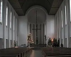 Während der Bau außen deutlich expressionistischen Einflüssen unterliegt, ist das Innere traditioneller gehalten. Das hohe Mittelschiff ist mit einer torkretierten Tonne überwölbt. Dazu im Gegensatz stehen die relativ niedrigen Seitenschiffe. Der Chorraum wurde von Klaus Ringwald gestaltet.
