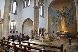 Bei der Umgestaltung des Altarraums 1974/75 wurde die funktionslos gewordene Kommunionbank entfernt und eine in den Raum vorgerückte Altarinsel geschaffen. Den Altar und den Ambo gestaltete der Bildhauer Frido Lehr. Die reichhaltige Ausmalung der Kirche ging im Zweiten Weltkrieg verloren. 1960 schuf Rudolf Kaufhold ein neues Altarraumbild. Es zeigt Jesus Christus mit einladender Geste. Zu seinen Füßen sind die Heiligen Vinzenz Pallotti, Bernhard von Baden, Karl Borromäus, Laurentius, Agnes, Margareta Maria Alacoque, Johannes und Theresia dargestellt. Der geschnitzte Kreuzweg stammt von 1905.