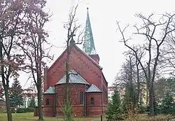 Das gesamte unverputzte Kirchengebäude ist in neoromanischer Backsteinbauweise errichtet und mit Verblendungen sparsam geschmückt. Es verfügt über einen Westturm mit quadratischem Grundriss, die Apsis auf der Ostseite ist halbrund und mit einem (halben) Runddach versehen. Das Pultdach des Kirchenschiffes ist mit Schiefer gedeckt.[1] Die fünf Fenster auf jeder Seite des Hauptschiffs sind als Rundbogen ausgeführt und etwas asymmetrisch über die Länge des Schiffes eingebaut.