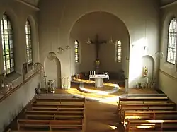 Der Altarbereich liegt hinter dem Triumphbogen und bildet eine Halbrundapsis, in der ein schlichter Altartisch steht. An der Wand dahinter hängt mittig ein geschnitztes Kruzifix, rechts und links daneben sind zwei kleinere Halbrundfenster in das Mauerwerk eingefügt. In den Hauptraum ragen zwei übereinander angeordnete gerundete Podien.[13]