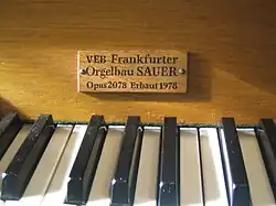 Auf der Empore befindet sich eine einmanualige Orgel der Firma Sauer Frankfurt(Oder), erbaut 1978 (Opus 2078).