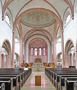 Die Hauptapsis ist durch einen Bogen leicht eingezogen und durch eine rundbogige Fensterreihe mit Überfangbögen belichtet. Eine Kalotte schließt den früheren Hochaltarbereich nach oben ab.