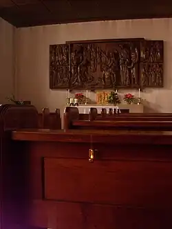 An der rechten Seitenwand sind Figuren vom hl. Bruder Konrad und von der hl. Anna angebracht.