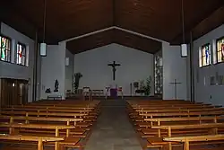 Der mit dem Bau beauftragte Architekt Salvatore Broggi erstellte eine einfache Saalkirche mit Satteldach und nordwestlich freistehendem Turm. Der leicht eingezogene Eingangsbereich führt unter der Empore in den grosszügigen Innenraum. Die Holzdecke folgt innen der Form des Satteldachs und ist seitlich mit Stahlsäulen abgestützt. Der eingezogene Chor wird südseitig durch hohe Betonrasterfenster mit Tageslicht beleuchtet. Das grosse Kruzifix an der Chorrückwand betont die zur Mitte ausgerichtete Gestaltung der Kirche.