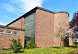 Die geostete Saalkirche auf quadratischem Grundriss mit halbrunder Apsis ist aus Backstein gebaut. Der Glockenturm steht frei.