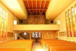 Die dreischiffige Kirche ist als Wegekirche konzipiert, indem die ganze Raumgestaltung samt den Bänken der Gläubigen auf die Christusstatue im Chorraum ausgerichtet ist. Der Gläubige kann beim Betreten der Kirche zudem seinen eigenen Weg als Christ innerlich nachvollziehen. So befindet sich die Taufkapelle beim Kircheneingang und erinnert den Gläubigen an seine eigene Taufe. Über dem Taufstein stellt das Glasfenster die Taufe Jesu durch Johannes den Täufer dar. Links und rechts sind im Glasfenster die Worte zu lesen: „Ich taufe dich im Namen des Vaters und des Sohnes und des Heiligen Geistes. Amen.“ Nach der Aufnahme in die kirchliche Gemeinschaft durch die Taufe führt der Weg des Gläubigen weiter in den Hauptraum der Kirche, der auf den Altarraum ausgerichtet ist, wo das Sakrament der Eucharistie zelebriert wird und wo an der Chorwand eine Statue des auferstandenen Christus angebracht ist. Links von ihm betet die Hl. Theresia vom Kinde Jesu zu Christus, rechts ist Bischof Ulrich von Augsburg zu erkennen. Links vom durch Stufen vom Kirchenschiff abgesetzten Altarraum befindet sich an der Frontwand des Seitenschiffs der Tabernakel, über dem der Heilige Geist in Form einer Taube niederschwebt. Auf der rechten Seite des Altarraums ist an der Frontwand des zweiten Seitenschiffs eine Muttergottesstatue angebracht. Das Tageslicht fällt durch eine Fensterfront, welche sich auf beiden Seiten des Längsschiffs der Kirche befindet. Die Glasfenster tauchen die Kirche in rotgoldenes Licht. Die Hauptausstattung erhielt die Kirche durch die Bildhauerarbeiten von Emil Sutor.