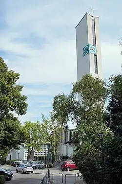Im Westen wird der Hauptraum durch die tiefer gelegene Taufkapelle abgeschlossen. Unter dem kleineren Raum befindet sich die Unterkirche, unter dem Hauptraum der Gemeindesaal mit Bühnenanlage. Der an den Terrassenhof angegliederte, freistehende 31,80 m hohe Glockenturm trägt ein Kreuz mit 3 m Höhe. An der Ostseite befindet sich das Gemeindezentrum mit zahlreichen Einzelräumen und Sakristei. An der Westseite, südlich nach dem Terrassenhof folgt ein Doppelhaus, welches für das Pfarramt und die Personalwohnungen errichtet wurde.[1]