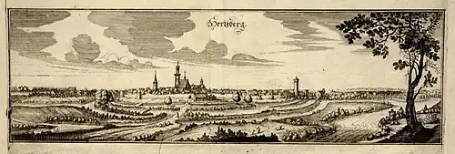 - Martin Zeiller: Hertzberg. In: Matthäus Merian (Hrsg.): Topographia Superioris Saxoniae, Thuringiae, Misniae et Lusatiae (= Topographia Germaniae. Band 12). 1. Auflage. Matthaeus Merians Erben, Frankfurt am Main 1650, S. 102 (Volltext [Wikisource]).